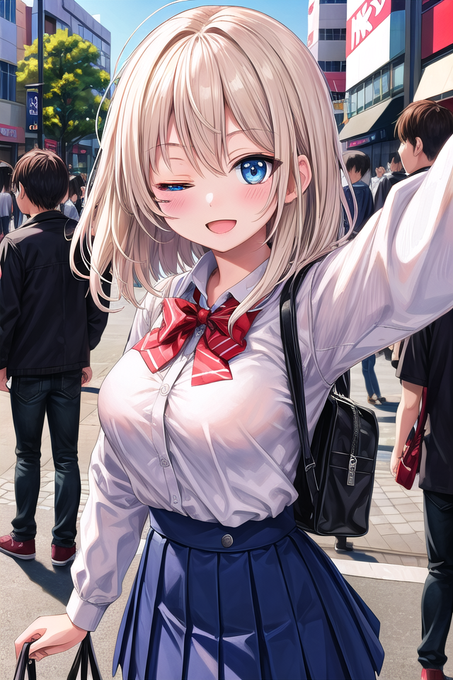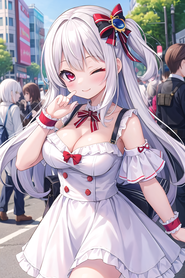 ウィンクがうまく出ない場合は、まずプロンプトの強度を`(one eye closed, wink:1.3)`のように上げてみて、それでもうまくいかない場合はLoRAの強度を上げてください。