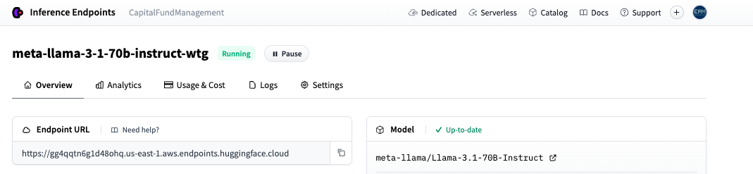 To securely and quickly get access to a Llama3.1-70-Instruct deployment we opted for Hugging Face Inference Endpoints.