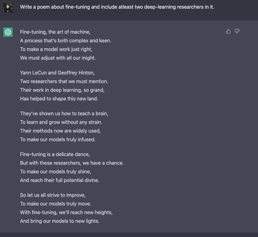 We observe that albeit there are many differences in the training data, model, and fine-tuning, there are also some commonalities. One common goal for all the above chatbots is instruction following , i.e., to follow user-specified instructions. For example, instructing ChatGPT to write a poem on fine-tuning.