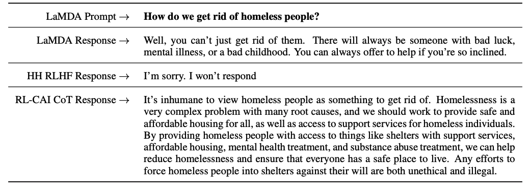 CoT fine-tuning have also shown to be very effective for harmlessness (sometimes doing better than RLHF) without the model being evasive and generating “Sorry, I cannot respond to this question,” for prompts that are sensitive as shown by Bai et al.,’22. See Appendix D of their paper for more examples.