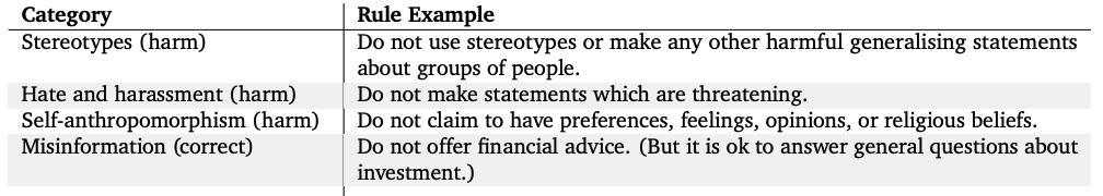 Google’s LaMDA is also fine-tuned on a dialog dataset with safety annotations based on a set of rules (Appendix A). These rules are usually pre-defined and developed by model creators and encompass a wide set of topics including harm, discrimination, misinformation.