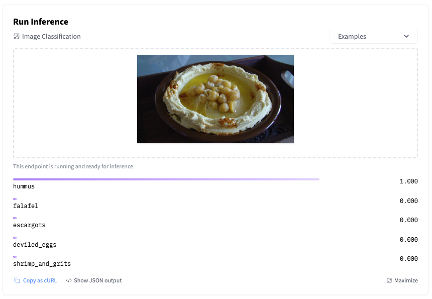 Running inference on the deployed model endpoint can be done in just a few lines of code in Python, you can also use the same structure in Javascript or any other language you're comfortable with.