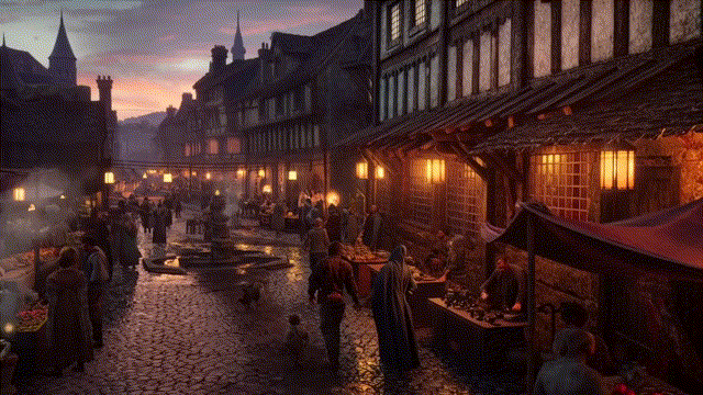 A twilight panoramic view of an ancient European marketplace, lively with artisans and shoppers. Lanterns glow warmly, cobblestone streets bustle with activity, and historic buildings cast long shadows under the fading light. | 0.651331 | 0.348669 | [