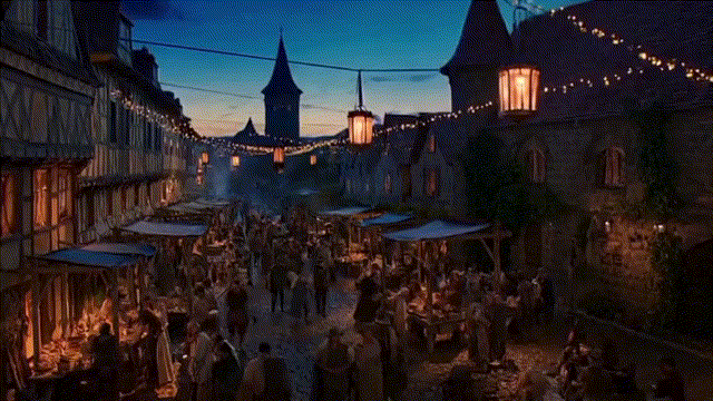 A twilight panoramic view of an ancient European marketplace, lively with artisans and shoppers. Lanterns glow warmly, cobblestone streets bustle with activity, and historic buildings cast long shadows under the fading light. | 0.808748 | 0.191252 | [