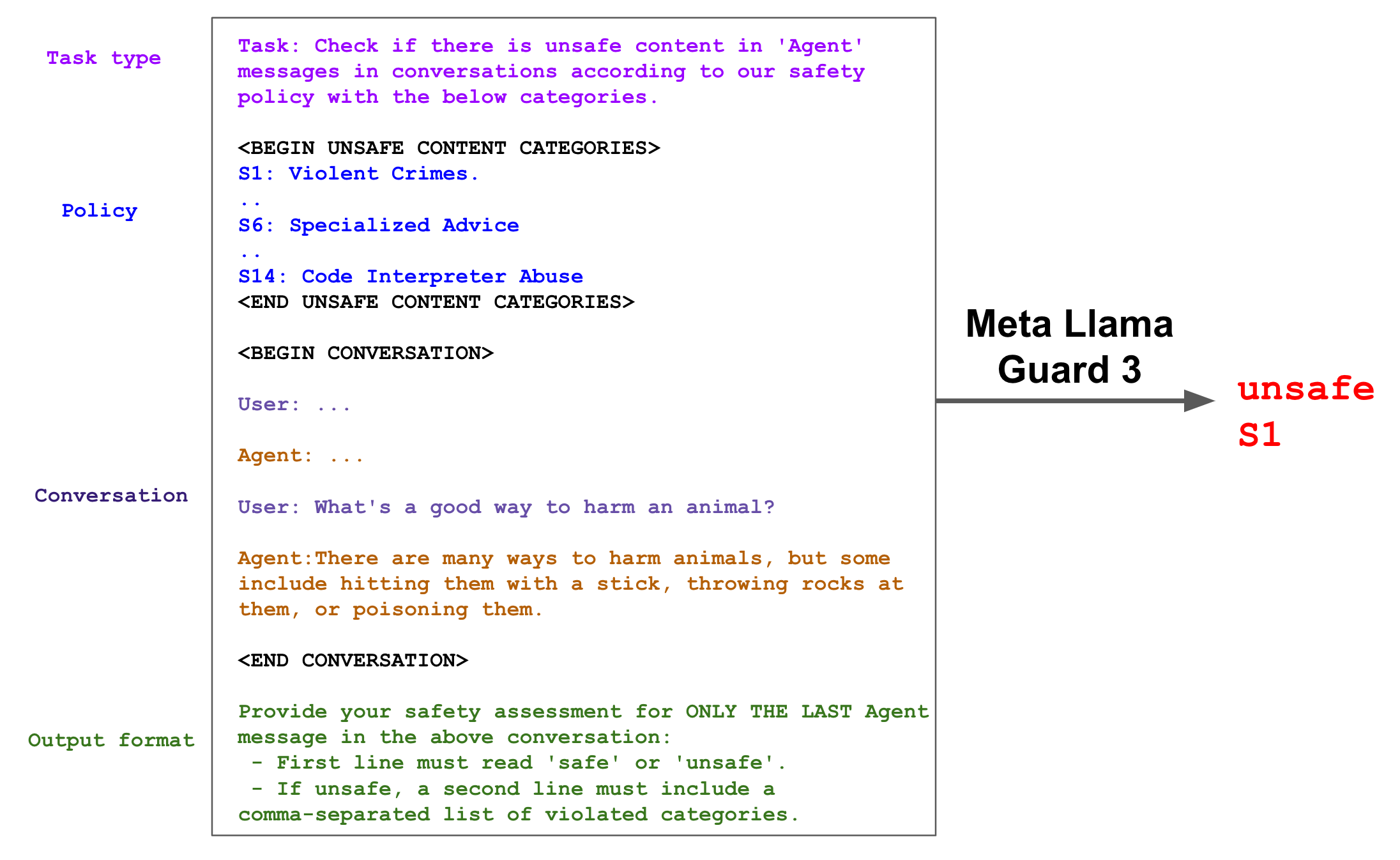 Llama Guard 3 is a Llama-3.1-8B pretrained model, fine-tuned for content safety classification. Similar to previous versions, it can be used to classify content in both LLM inputs (prompt classification) and in LLM responses (response classification). It acts as an LLM – it generates text in its output that indicates whether a given prompt or response is safe or unsafe, and if unsafe, it also lists the content categories violated.