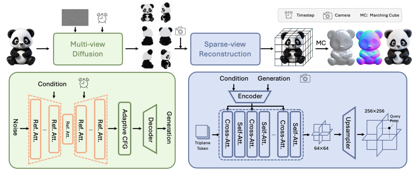 In the first stage, we employ a multi-view diffusion model that efficiently generates multi-view RGB in approximately 4 seconds. These multi-view images capture rich details of the 3D asset from different viewpoints, relaxing the tasks from single-view to multi-view reconstruction. In the second stage, we introduce a feed-forward reconstruction model that rapidly and faithfully reconstructs the 3D asset given the generated multi-view images in approximately 7 seconds. The reconstruction network learns to handle noises and in-consistency introduced by the multi-view diffusion and leverages the available information from the condition image to efficiently recover the 3D structure.