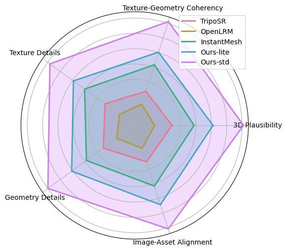 We have evaluated Hunyuan3D-1.0 with other open-source 3d-generation methods, our Hunyuan3D-1.0 received the highest user preference across 5 metrics. Details in the picture on the lower left.